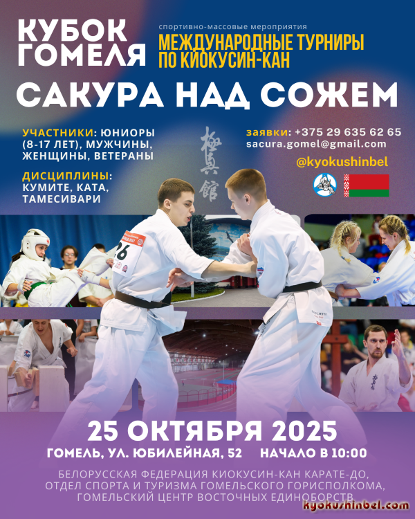 - Открытый международный турнир «Кубок Гомеля 2025» по киокусин-кан карате среди мужчин, женщин и ветеранов по весовым категориям в дисциплинах кумитэ, ката и тамесивари у мужчин и ветеранов.